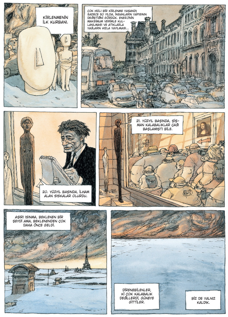 Buzul Çağı, Louvre Müzesi tarafından sipariş edilmiş bir çizgi roman. Ünlü sanat merkezi, Fransızların türe olan sevgisini hesap ederek ünlü sanatçılarla çalışıyor; Enki Bilal, David Prudhomme, Christian Durieux, Éric Liberge gibi isimlerin çizgi roman albümlerini yayımlıyor. Buzul Çağı da, Nicolas de Crécy imzasıyla bu seriden çıkmıştı. Albümlerin ortak özelliği, hikayelerinin bir biçimde müzeyle ilişkilendirilerek geliştirilmiş olması… Müze için doğrudan ve dolaylı, eğitici-öğretici-tanıtıcı bir yönü olsun istenmiş, ziyaretçilerin alıp inceleyeceği, sergilenen her şeyi başka türlü görüp anlayabileceği çizgi romanlar üretilmiş. Böyle tarif edince bir tür “broşür edebiyatı” veya “resimli müze kataloğundan” söz ediyorum sanılmasın. Anlatılan hikayeler mesaj kaygısıyla, talim terbiyeyle, pedagojik hassasiyetlerle kanırtılan, hikayeleri öteleyen şeyler değil.