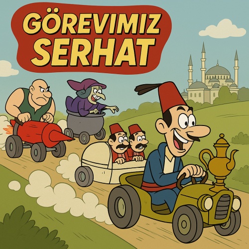 Yapay zekadan Görevimiz Serhat serisinin karikatürünü eski çizgi filmlerden Wacky Races tarzında çizmesini isteyince güzel sonuç verdi.