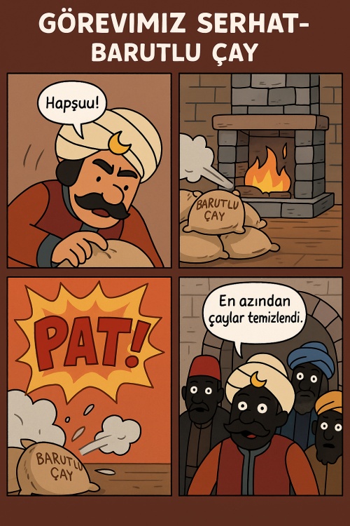 Bir ara da ikinci bölümdeki barutlu çay patlamasıyla üçüncü bölümde Serhat'ın davette yemek masasını yakmasını çizdirmiştim, yarın da onları paylaşırım.