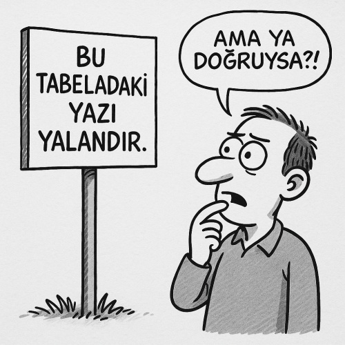 Kendi doğruluğuna işaret eden paradoksal önermelerin karikatür hali. Bu tarz paradoksun başka çeşitleri de var. "Ben her zaman yalan söylerim" gibi. Ya da bir kağıt parçası var bir yüzünde "Bu kağıdın diğer yüzünde yazan doğrudur" yazıyor. Diğer yüzünde ise "Bu kağıdın diğer yüzünde yazan yanlıştır" yazıyor. Önermeler mantığında bir önermenin doğruluk değeri ya birdir ya sıfırdır ama kendi doğruluğuna işaret eden önermeler böyle paradoks yaratabiliyor, matematikte sayıyı sıfıra bölmek gibi.